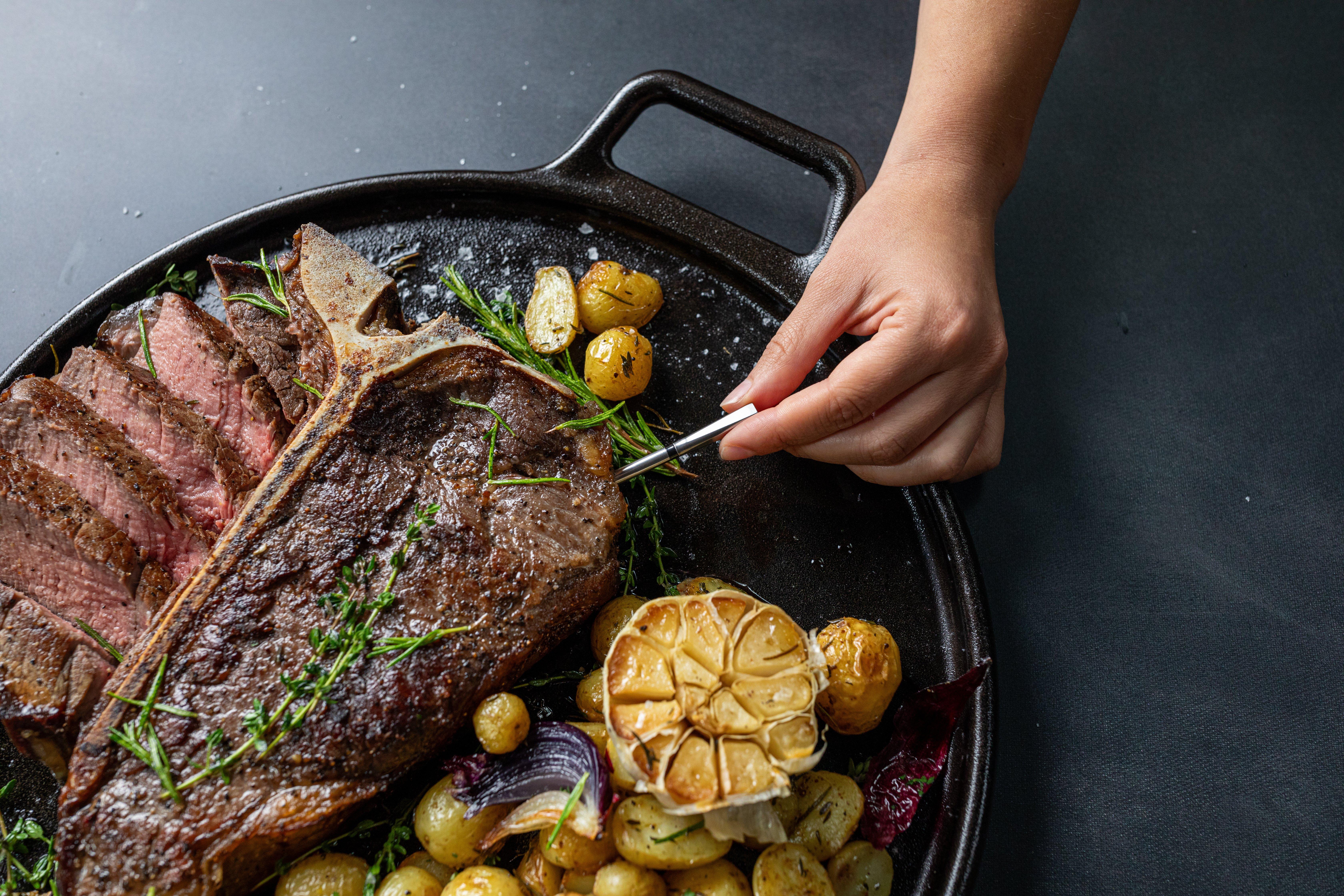 Select your protein and doneness preference, such as medium-rare steak, roasted chicken, or smoked brisket.